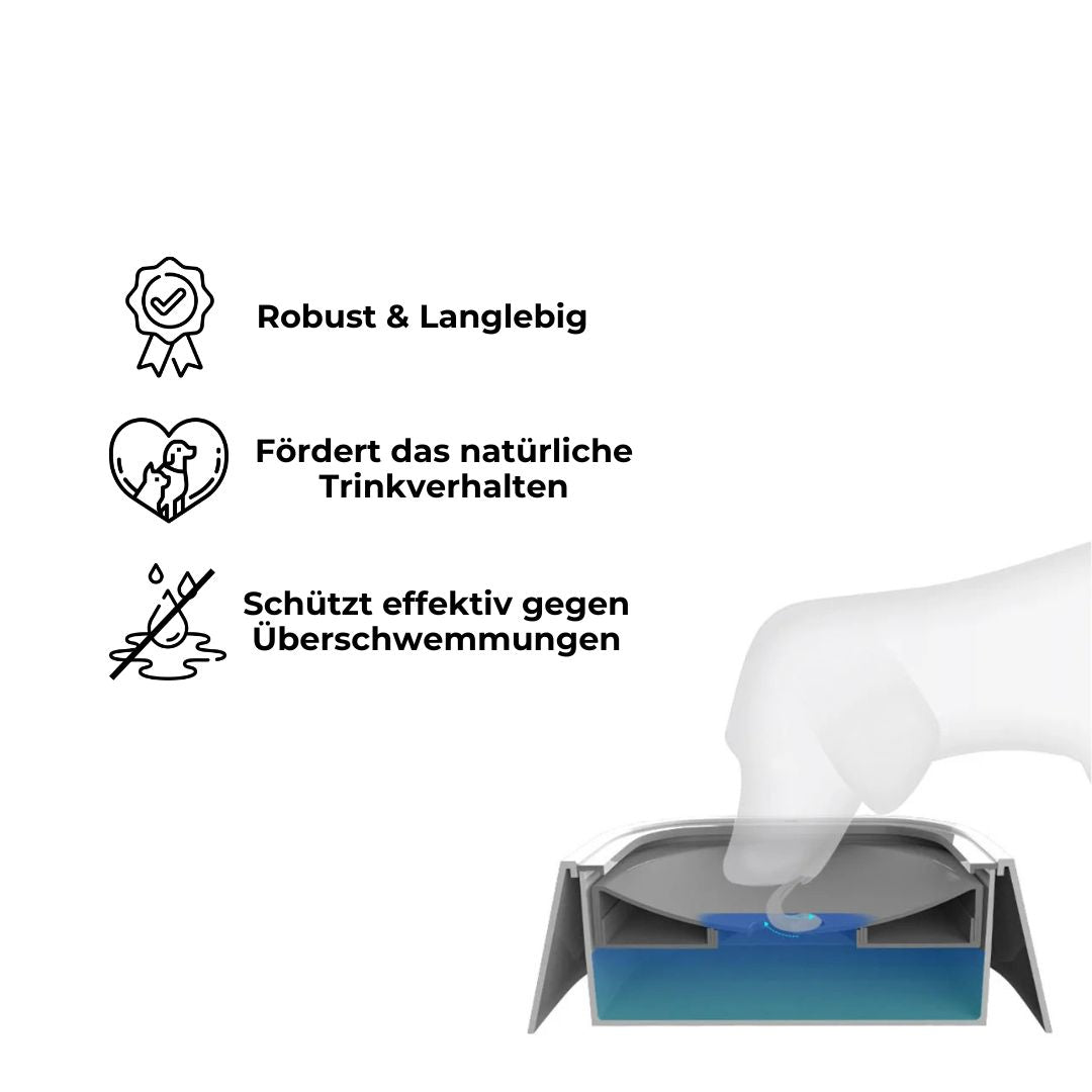 Mit AntiSplash gehört das Problem von spritzendem Wasser beim Trinken der Vergangenheit an. Die innovative schwimmende Trinkfläche sorgt dafür, dass das Wasser nur in kleinen Mengen freigegeben wird – für saubere Böden und einen gesunden Trinkfluss.